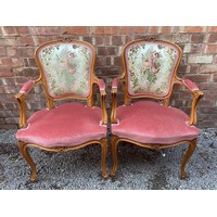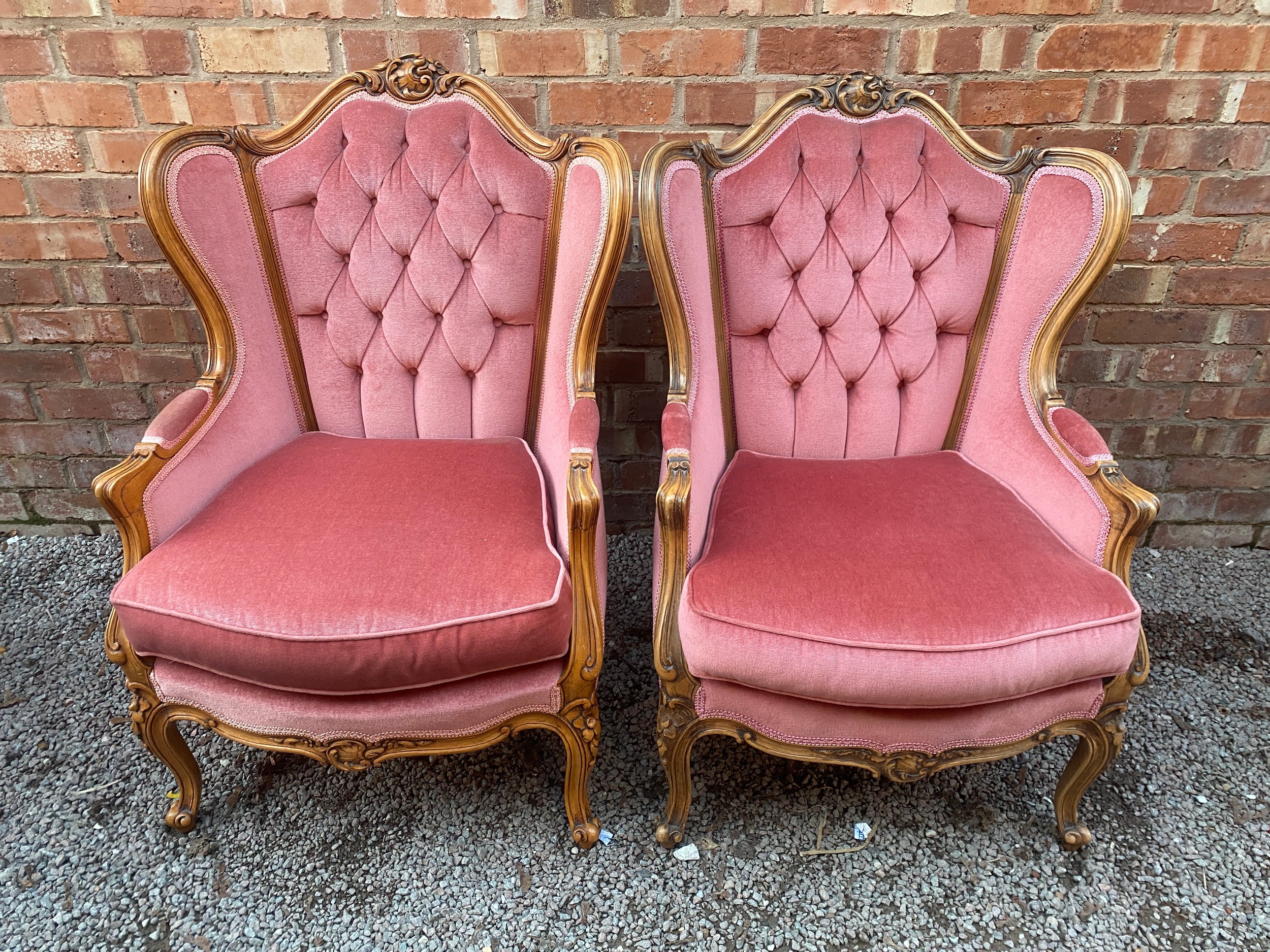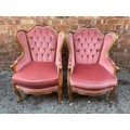 PAIR OF PINK BUTTON BACK WING CARVED FRAME ARMCHAIRS
