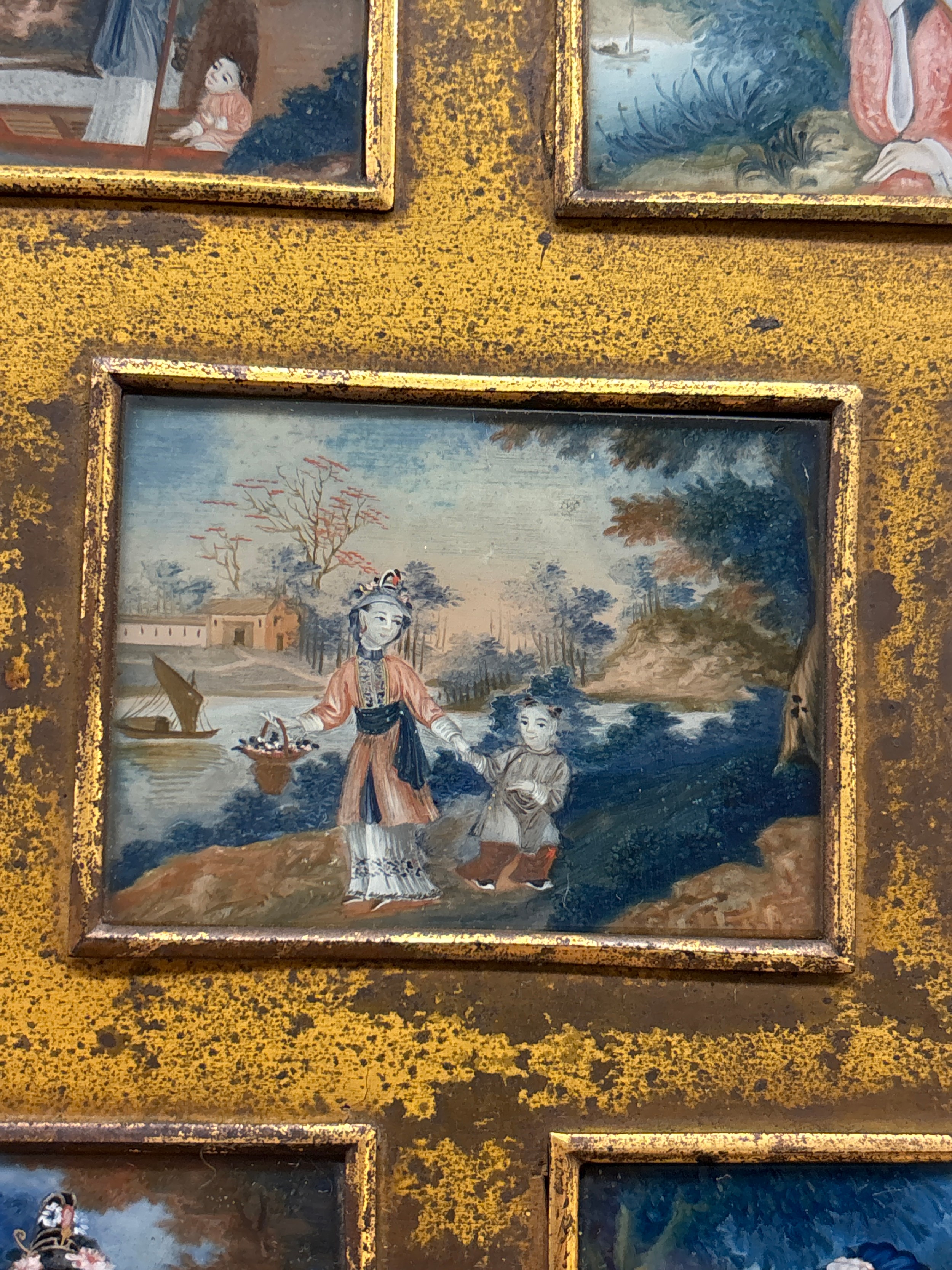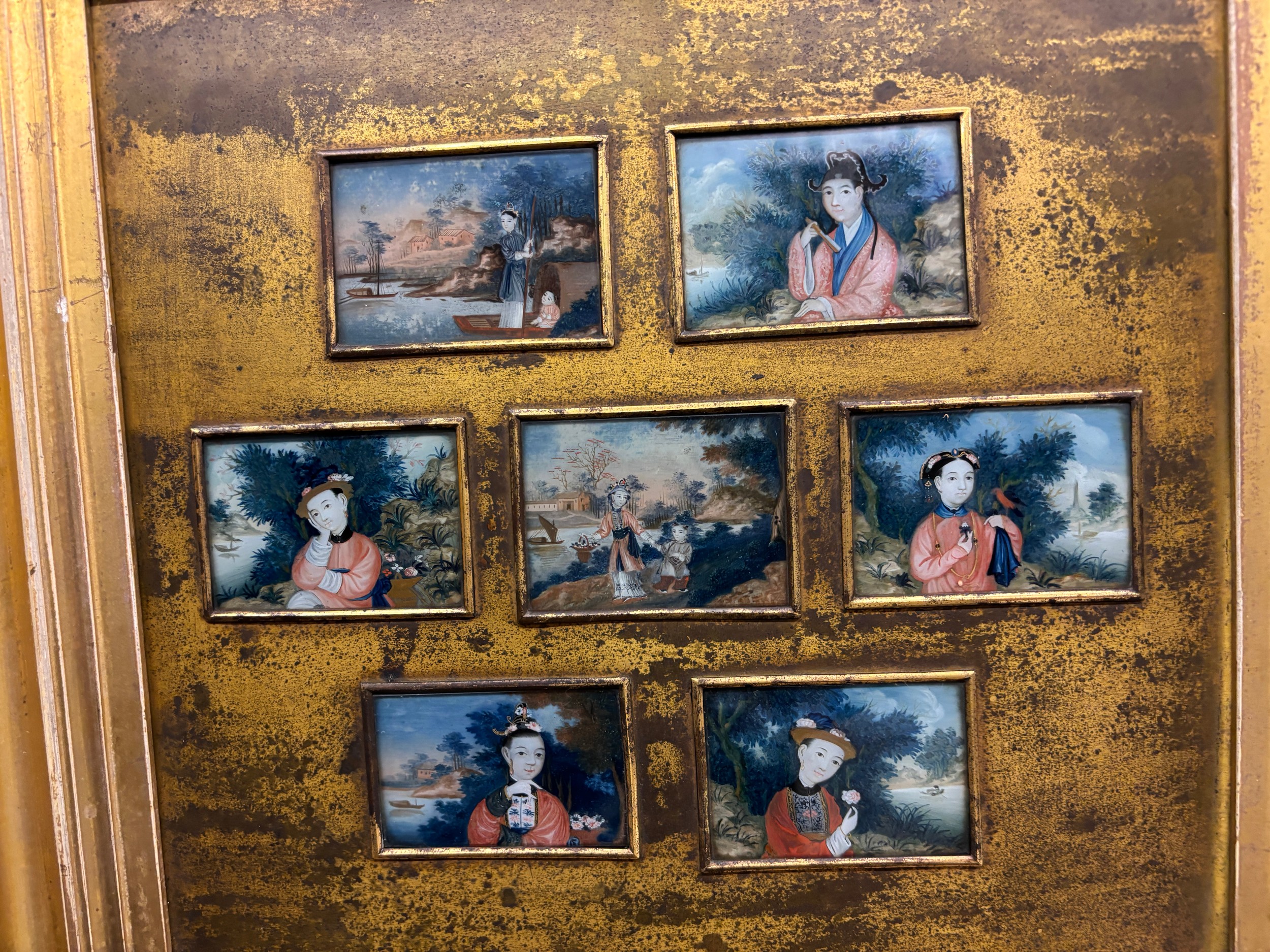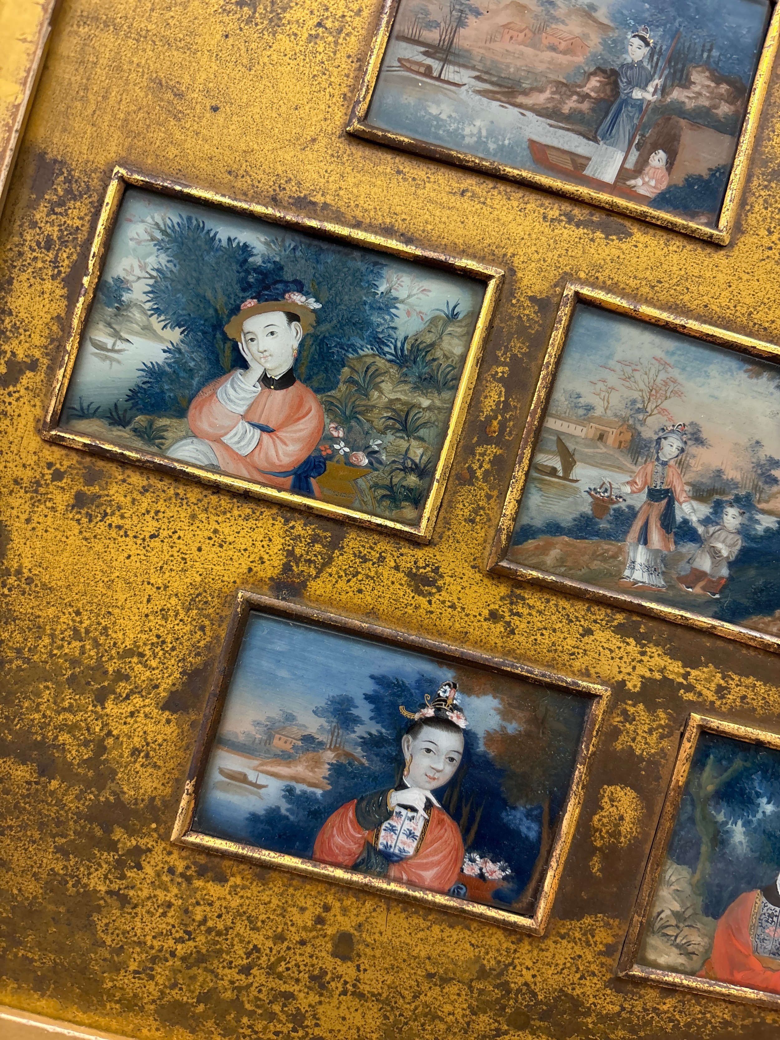 COLLAGE PANEL OF CHINESE MINIATURE PAINTINGS UNDER GLASS