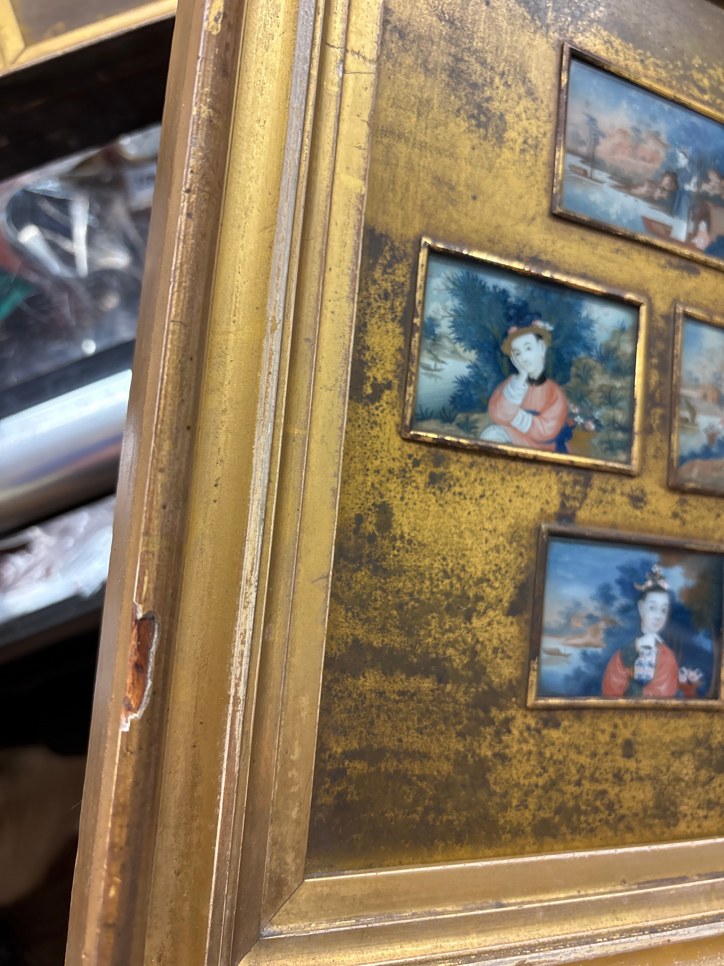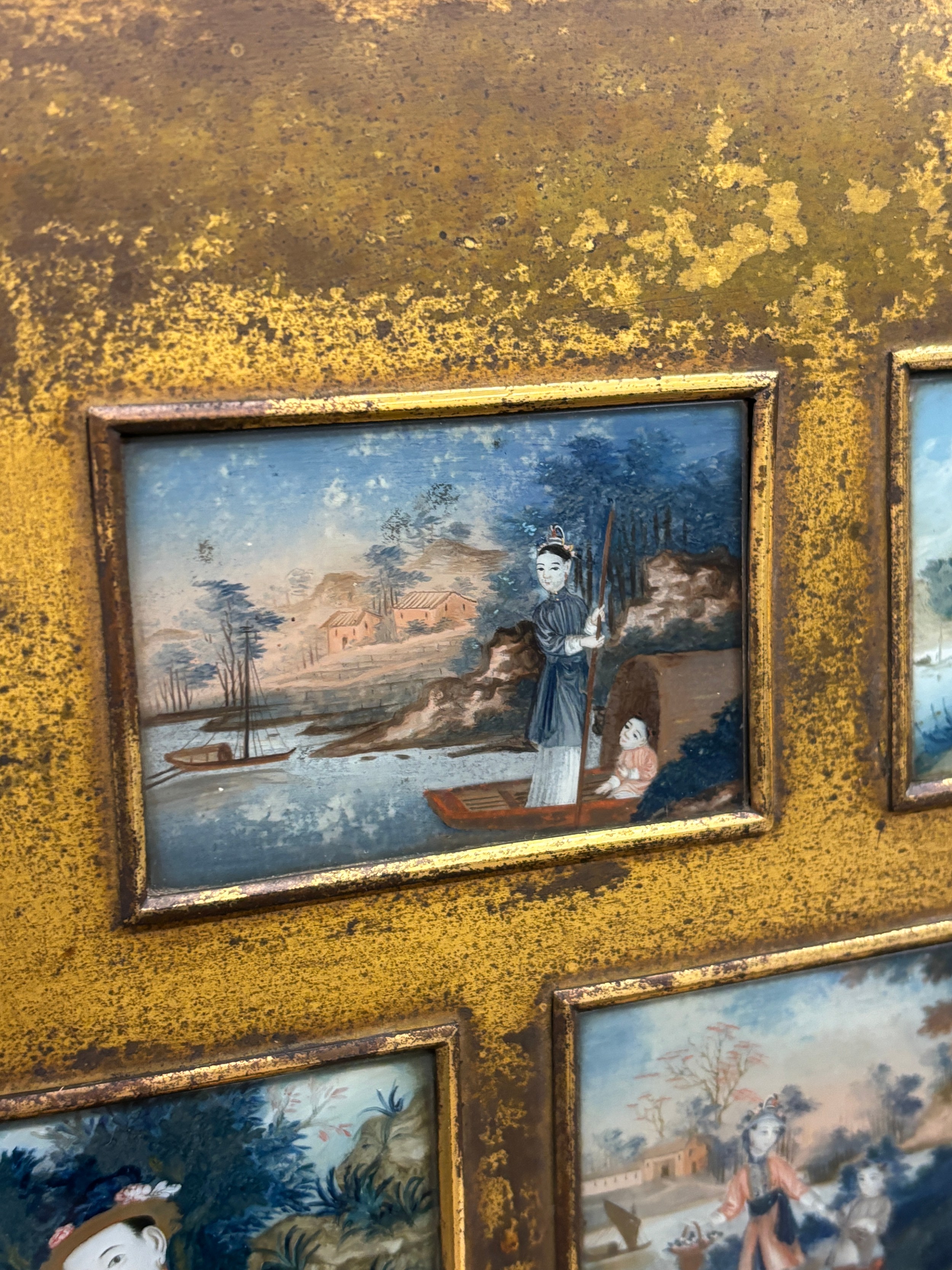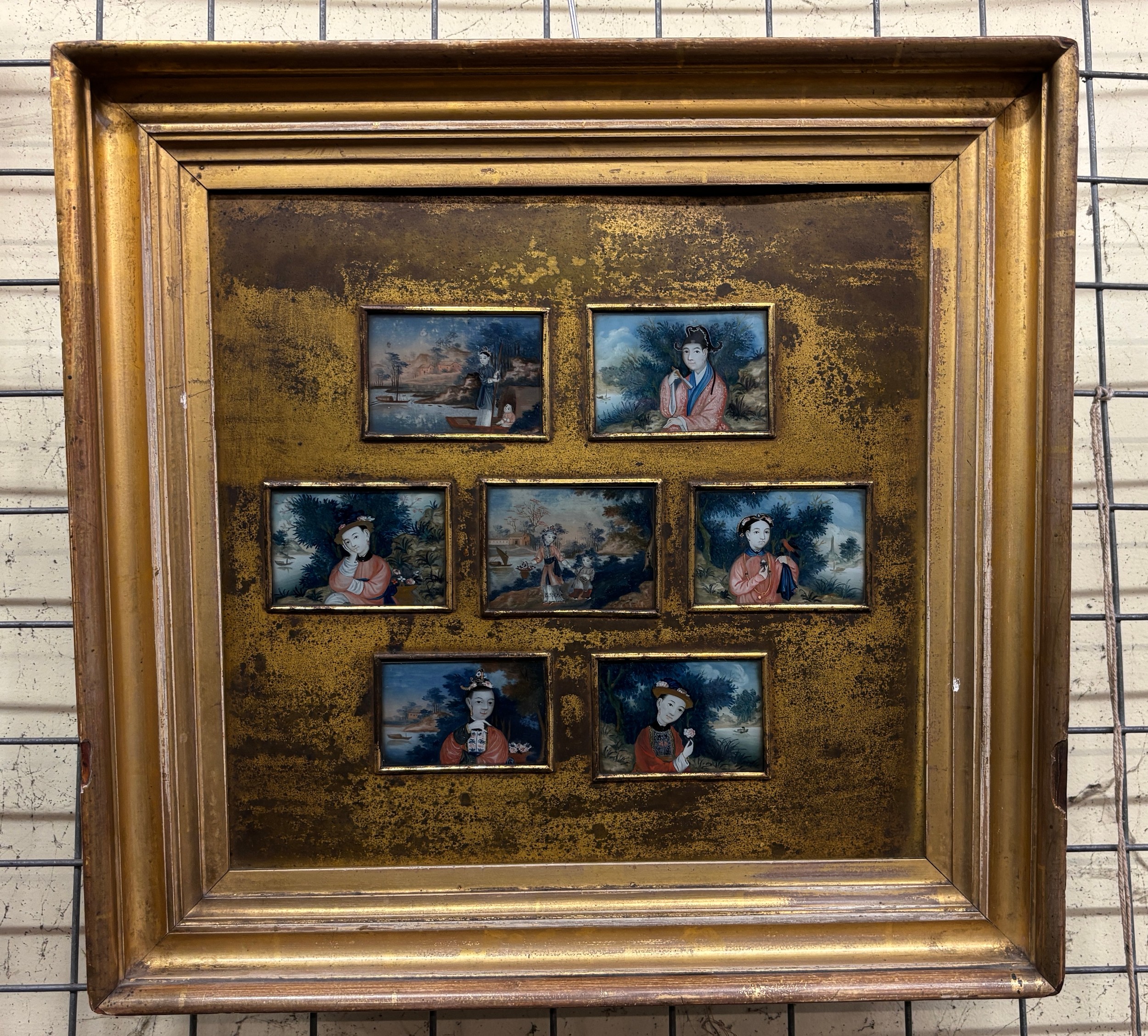 COLLAGE PANEL OF CHINESE MINIATURE PAINTINGS UNDER GLASS