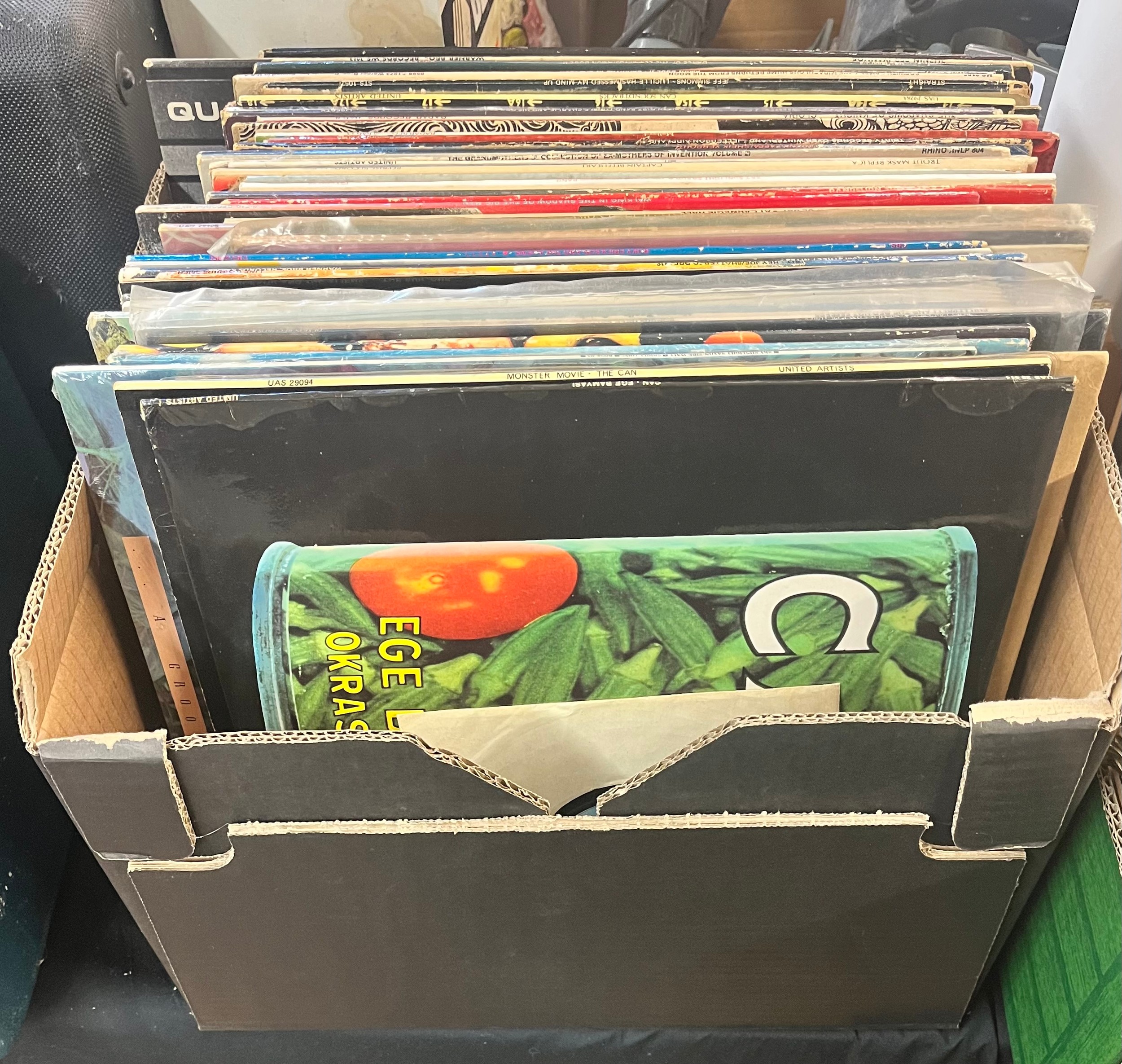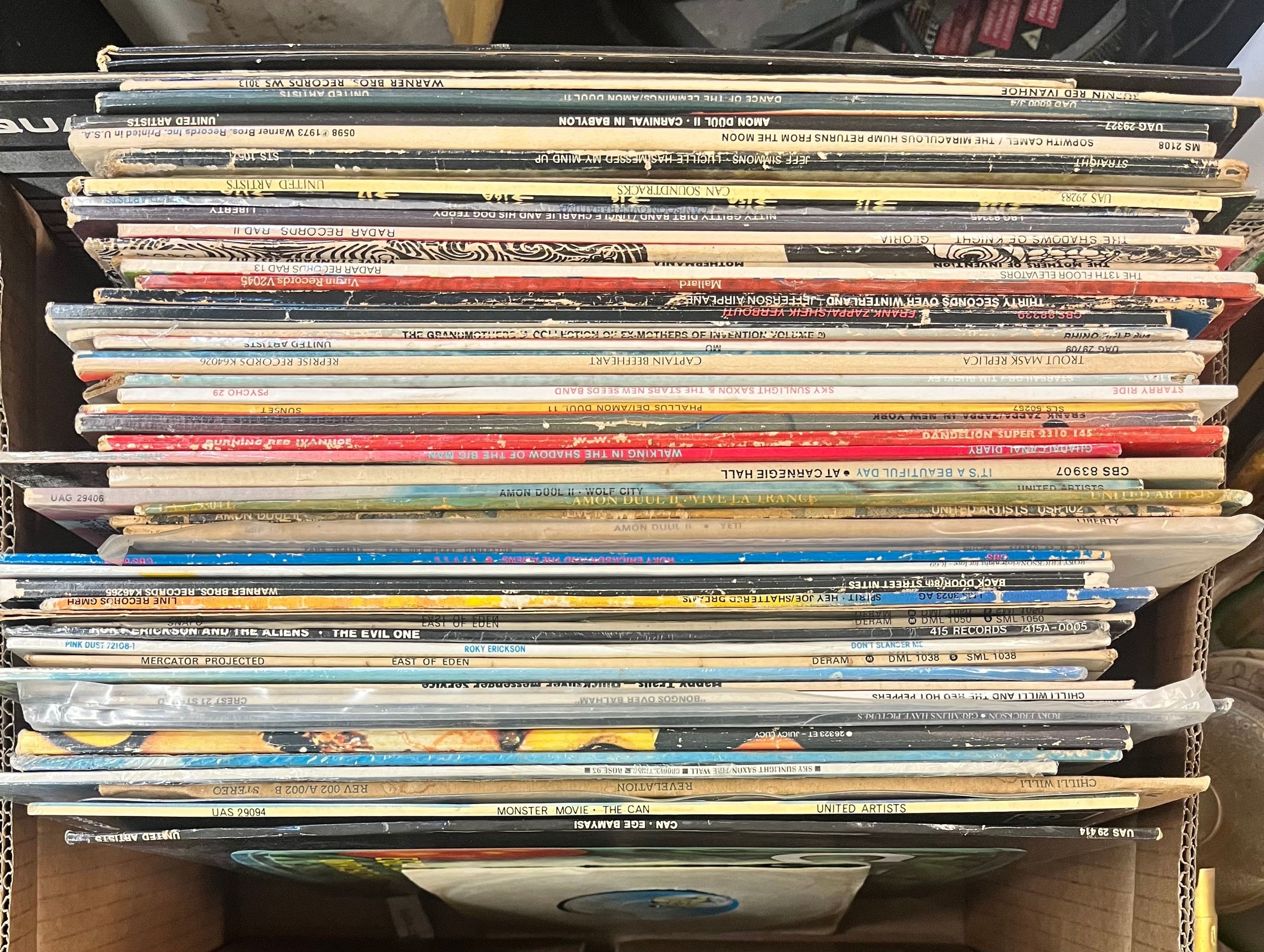BOX OF 1960/70'S VINYL LP RECORDS - PSYCHEDELIC/PROG ROCK INCLUDING QUATERMASS - GATEFOLD (SHVL775), AMON DUUL II, SOPWORTH CAMEL, CAN, JEFFERSON AIRPLANE, NICK DRAKE, SPIRIT, JEFF SIMMONS, 13TH FLOOR ELEVATORS, BYRDS PICTURE VINYL, GROUNDHOGS AND OTHERS