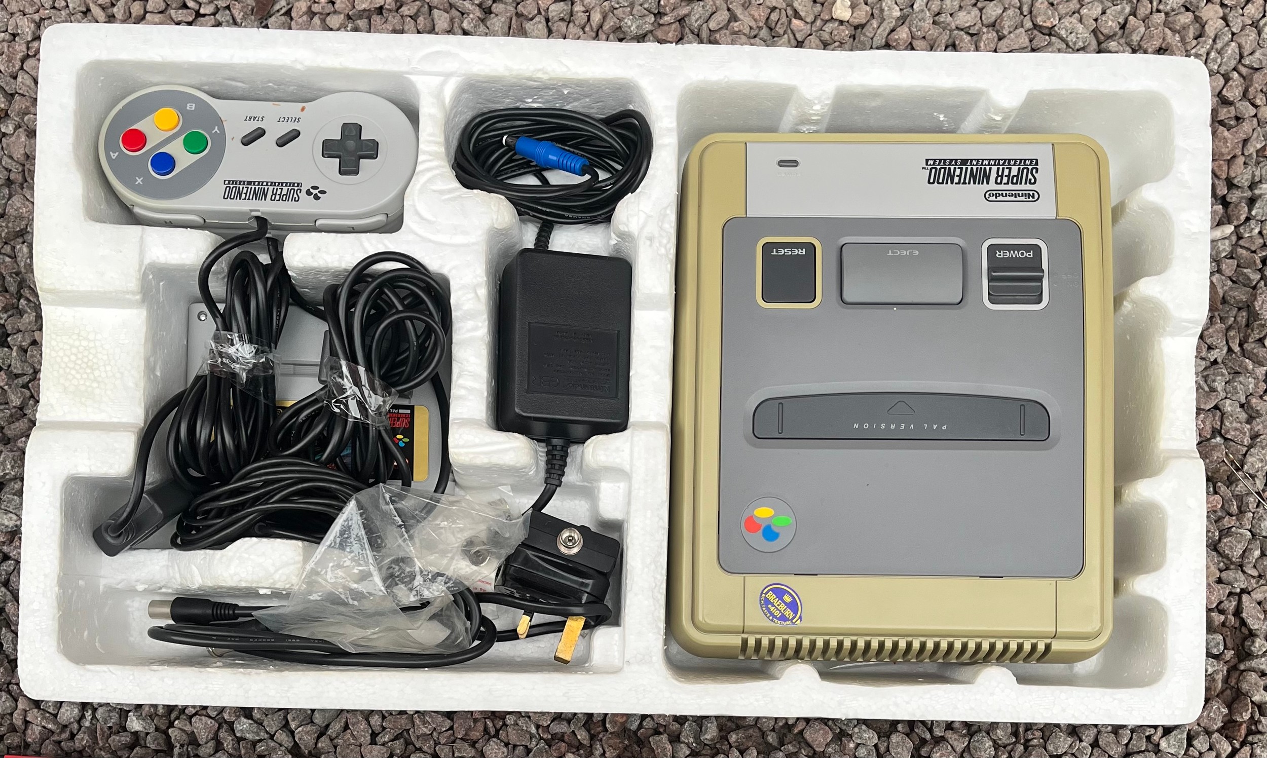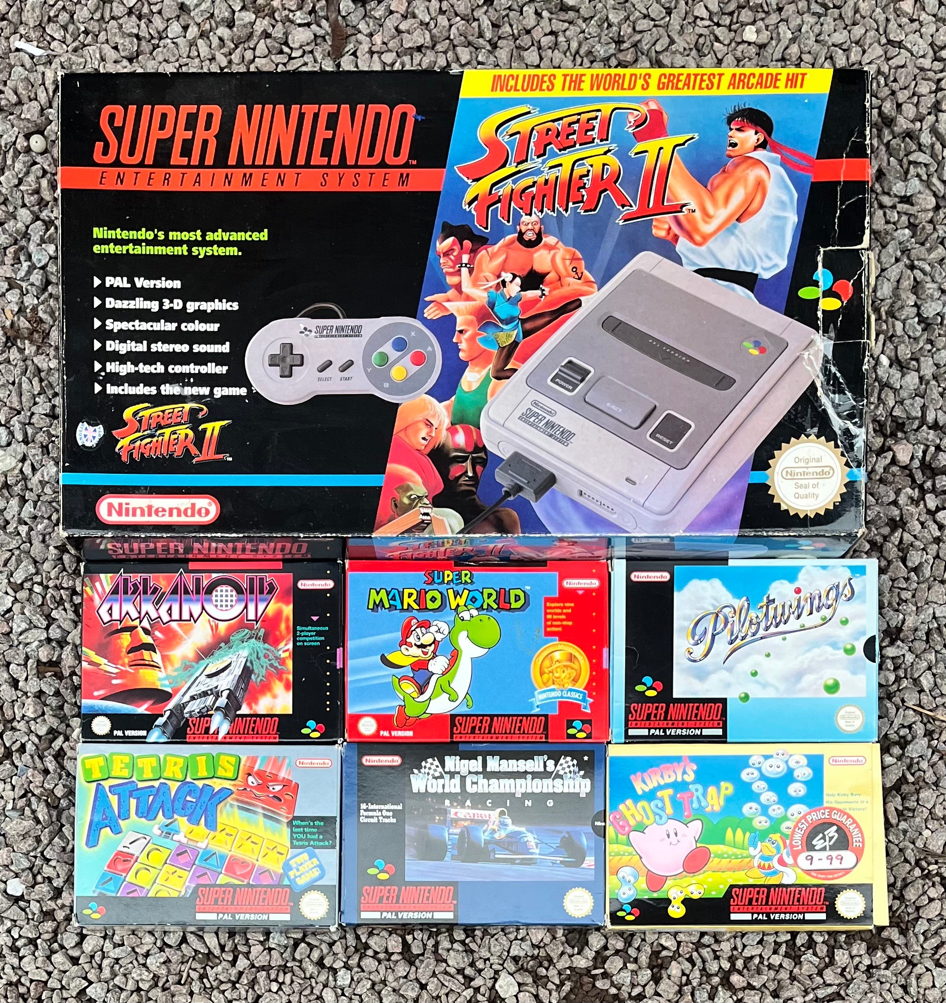 BOXED NINTENDO SUPER NINTENDO ENTERTAINMENT SYSTEM AND SELECTION OF BOXED GAMES INC. MARIO AND KIRBY
