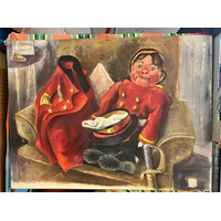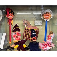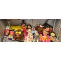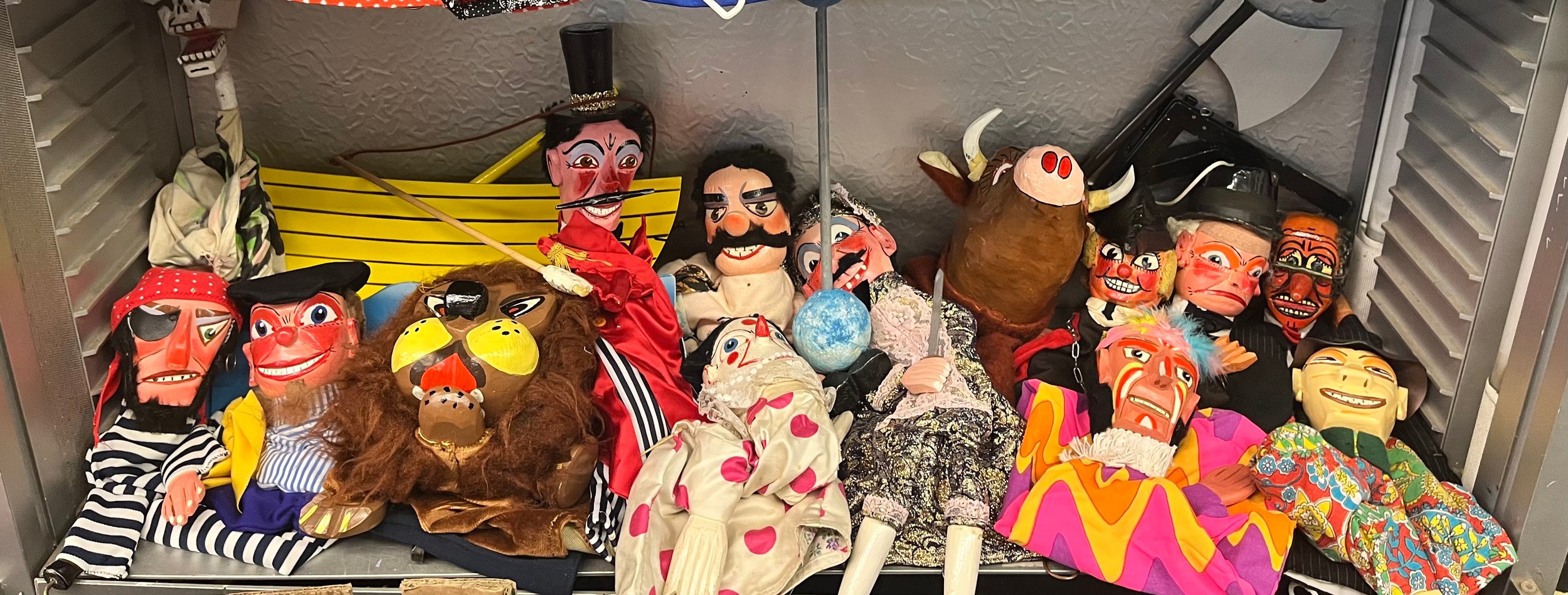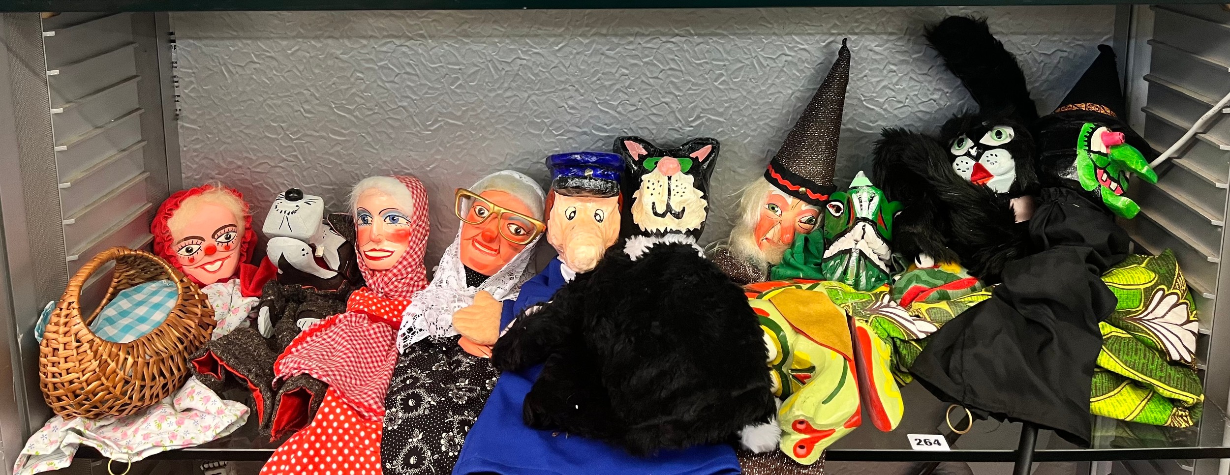 TWO SHELVES OF HANDMADE PUPPETS INC. RED RIDING HOOD, BIG BAD WOLF, MERLIN, PIRATES, LION TAMER, MATADOR AND POSTMAN PAT