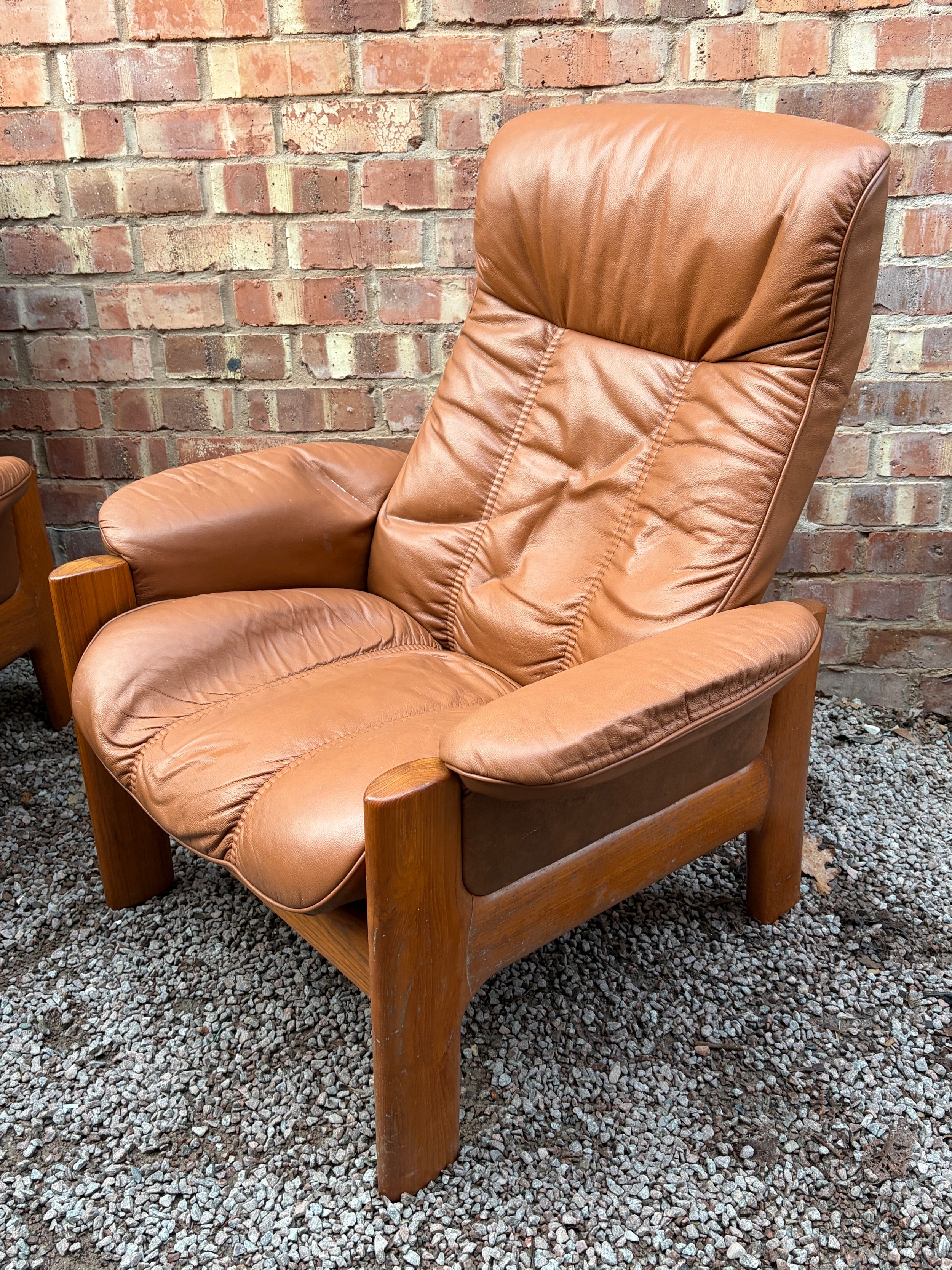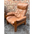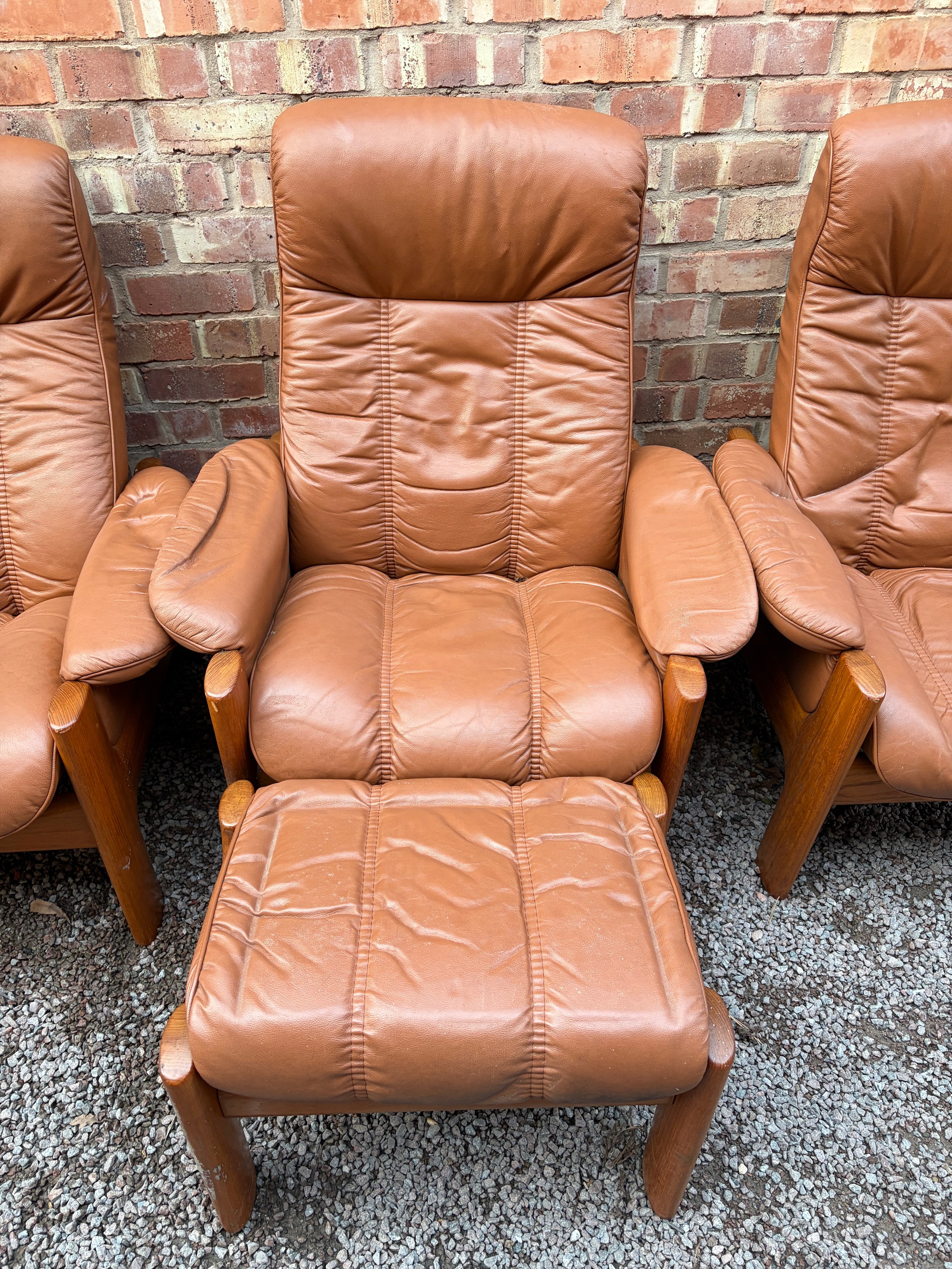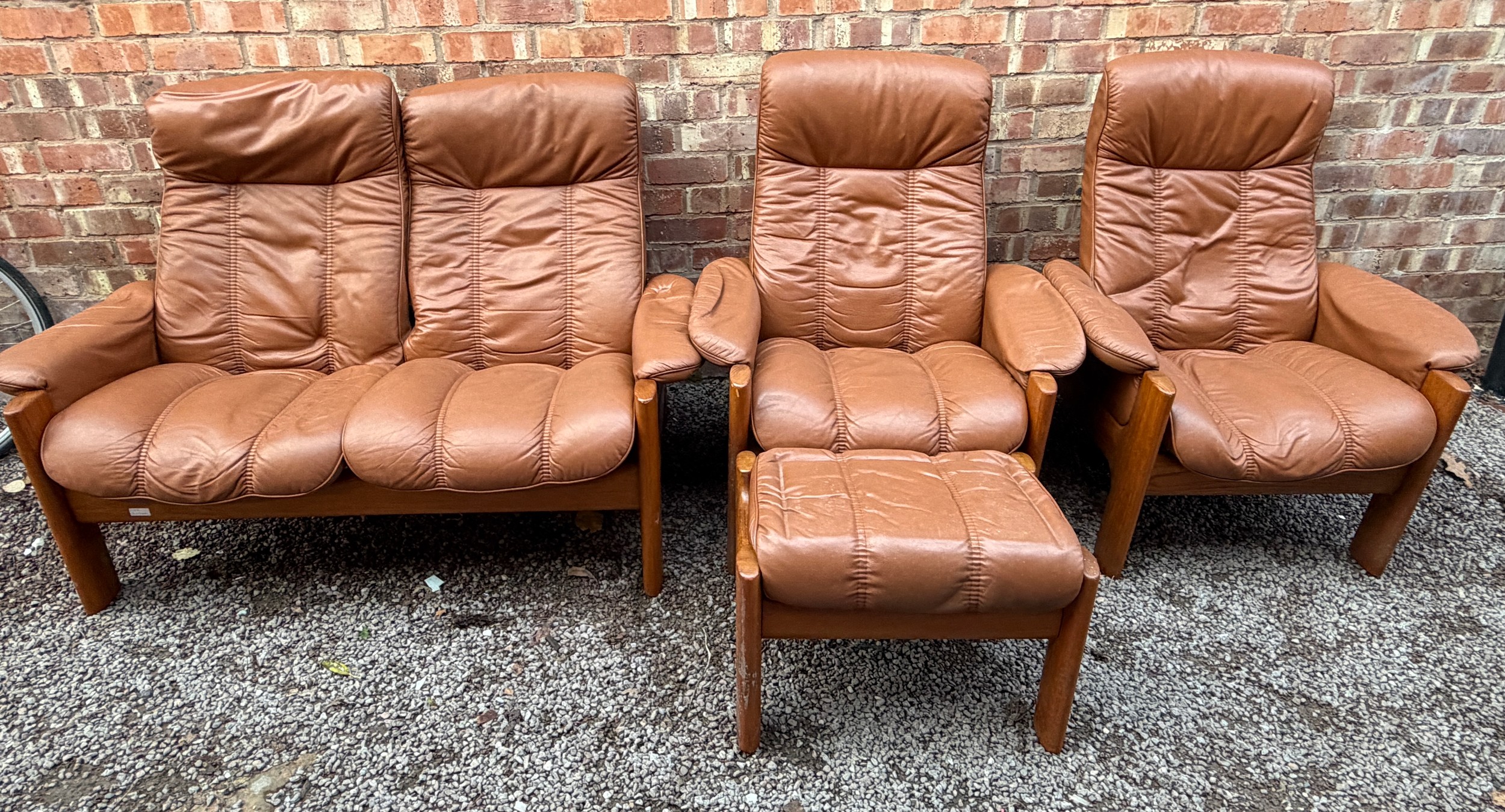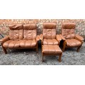 EKORNES NO.625 BROWN WOODEN SHOW FRAME SOFA SUITE WITH STORAGE STOOL